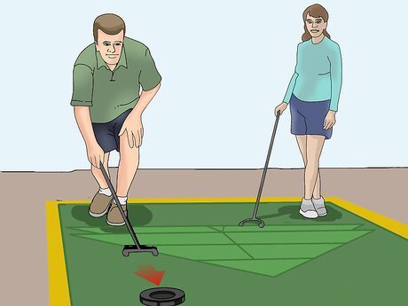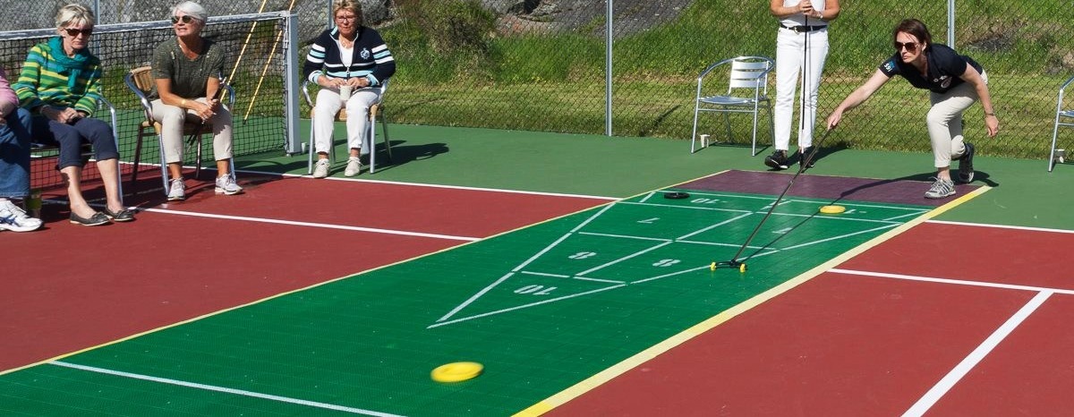 O objetivo principal do jogo é lançar os discos, com o auxílio do taco, de forma que deslizem sobre a pista e parem dentro das pontuações (7, 8 ou 10) do triângulo oposto.